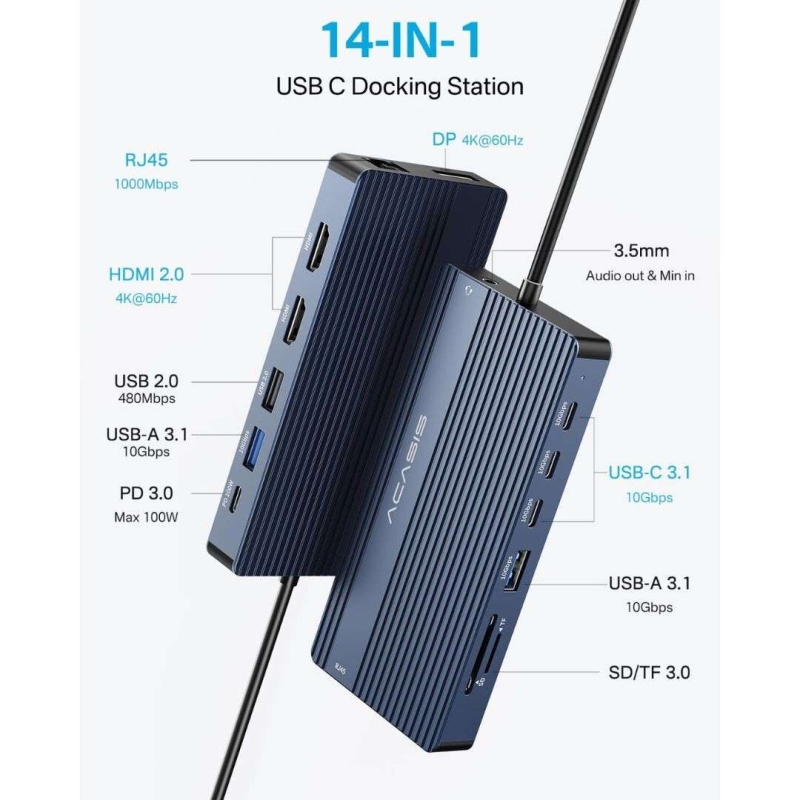 The ACASIS 14-in-1 USB C Docking Station is a versatile and powerful expansion hub for laptops, offering dual 4K HDMI and 1 DP port, USB 3.1 Type-C and Type-A ports, SD/TF card reader, Gigabit Ethernet, 3.5mm audio/microphone jack, and 100W fast charging. This docking station enables triple 4K display support (Windows only), provides rapid data transfer with 10Gbps USB ports, and allows quick charging for laptops and devices. It’s ideal for professionals, gamers, and content creators, designed to expand your workstation’s functionality effortlessly.