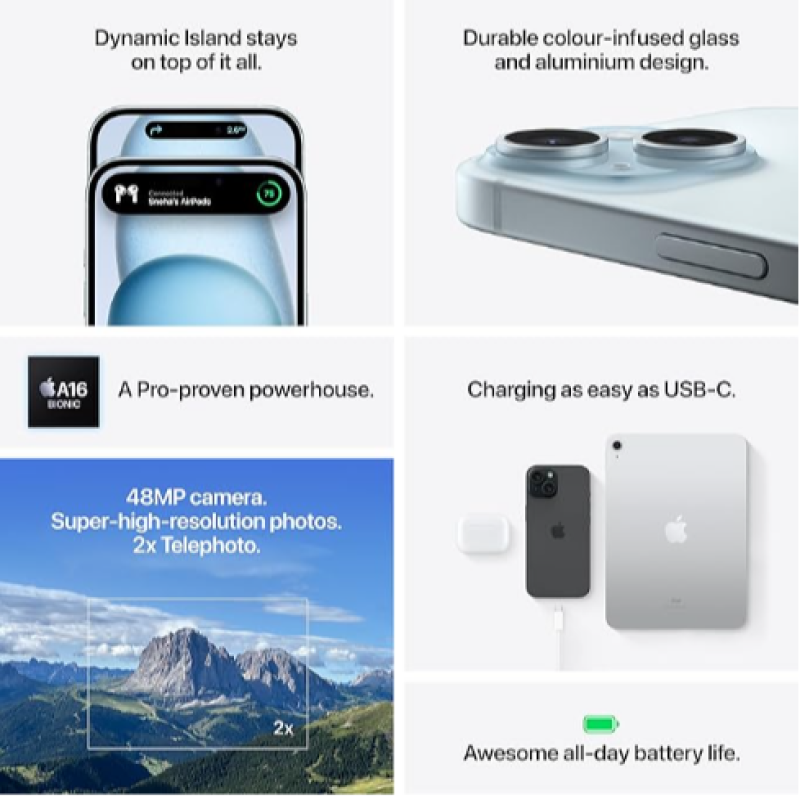 | Whats in the box | iPhone 15 1N, USB-C Charge Cable |